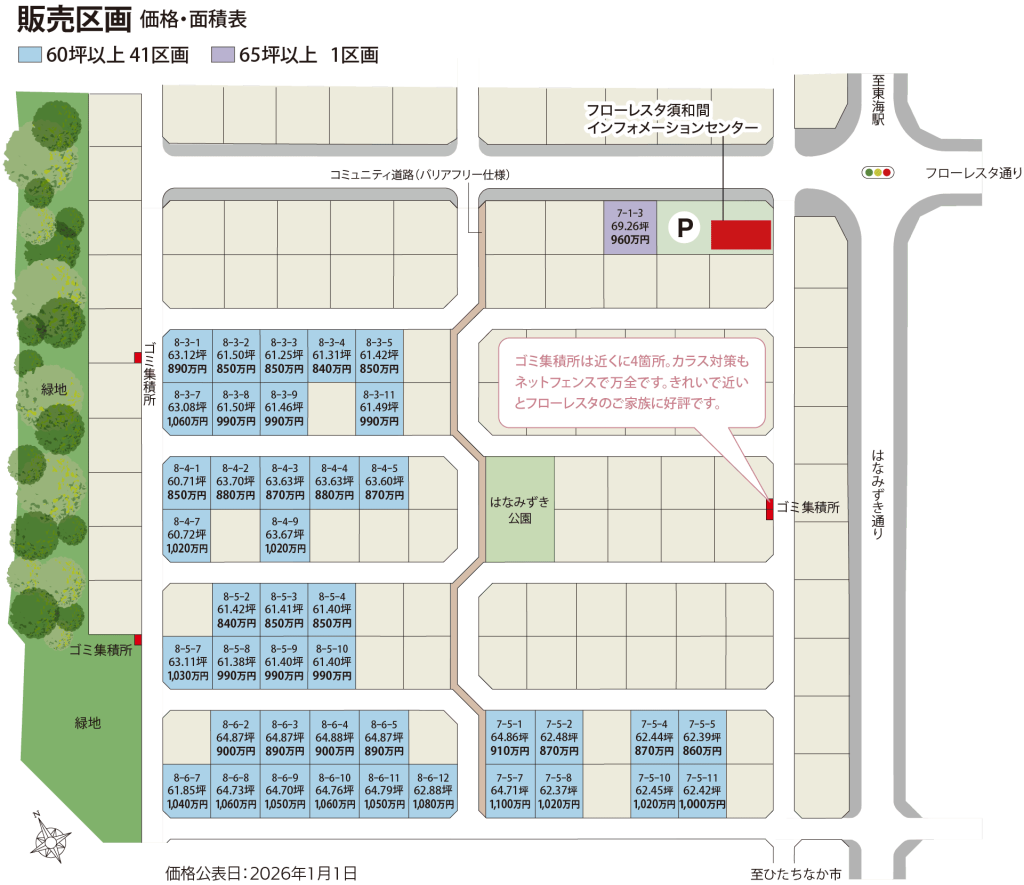 フローレスタ須和間 物件概要 ■全体概要 ●所在地:那珂郡東海村大字須和間2005-3ほか ●交通:JR常磐線「東海駅」下車、茨城交通バス「東海駅東口~フローレスタ須和間・南台・緑ヶ丘循環線」「フローレスタ須和間北」バス停徒歩2〜5分 ●総区画数:689区画 ●都市計画区域:市街化調整区域 ●用途地域:指定なし(建築協定有) ●建ぺい率:50% ●容積率:100% ●地目:宅地 ●開発許可番号:茨城県建指令第90号 許可番号第8号(1997年12月26日)、茨城県建指令第51号 変更許可番号第7号(1999年10月26日)、茨城県建指令第32号 変更許可番号第4号(2006年12月11日)、東海村指令第492号 変更許可番号第2号(2013年7月12日)、東海村指令第813号 変更許可番号第1号(2014年8月11日)、東海村指令第365号 変更許可番号第1号(2015年4月22日)、東海村指令第1711号 変更許可番号第1号(2021年12月3日) ●検査済証番号:第5・6・12工区第12号(2015年6月1日)、第7・8工区第62号(2022年1月28日) ●道路:幹線道路16mアスファルト舗装、区画道路6mアスファルト舗装(一部インターロッキング舗装)、緑道2mインターロッキング舗装 ●私道負担:なし ●設備:電気/東京電力、飲用水/村営水道、ガス/プロパン(集中供給方式)、汚水・雑排水/公共下水道、雨水/調整池へ放流 ●管理費等:附属施設維持管理基金100,000円、ケーブルテレビ個別引込工事費44,000円、水道加入金183,600円(7工区の一部)、187,000円(7・8工区)、附属施設運営費〈タウンセキュリティ費・JWAY基本視聴料、除草作業費など〉4,000円(月額) ●手付金保全:(株)常陽銀行 ●所属団体:(公社)茨城県宅地建物取引業協会 ■碧葉の風街区(建築条件なし)概要 ●今回販売区画数:42区画 ●土地面積:200.71㎡(60.71坪)〜228.96㎡(69.26坪) ●価格:840万円(2区画)〜1,100万円(1区画) ●最多価格帯:800万円台(18区画)