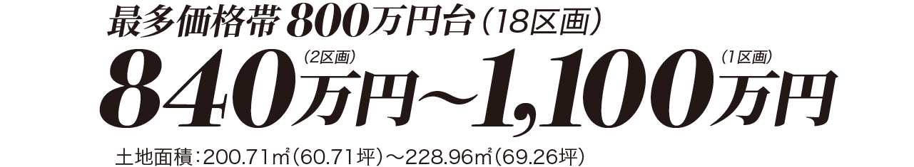 ●今回販売区画数:42区画 ●土地面積:200.71㎡(60.71坪)~228.96㎡(69.26坪) ●価格:840万円(2区画)~1,100万円(1区画) ●最多価格帯:800万円台(18区画)