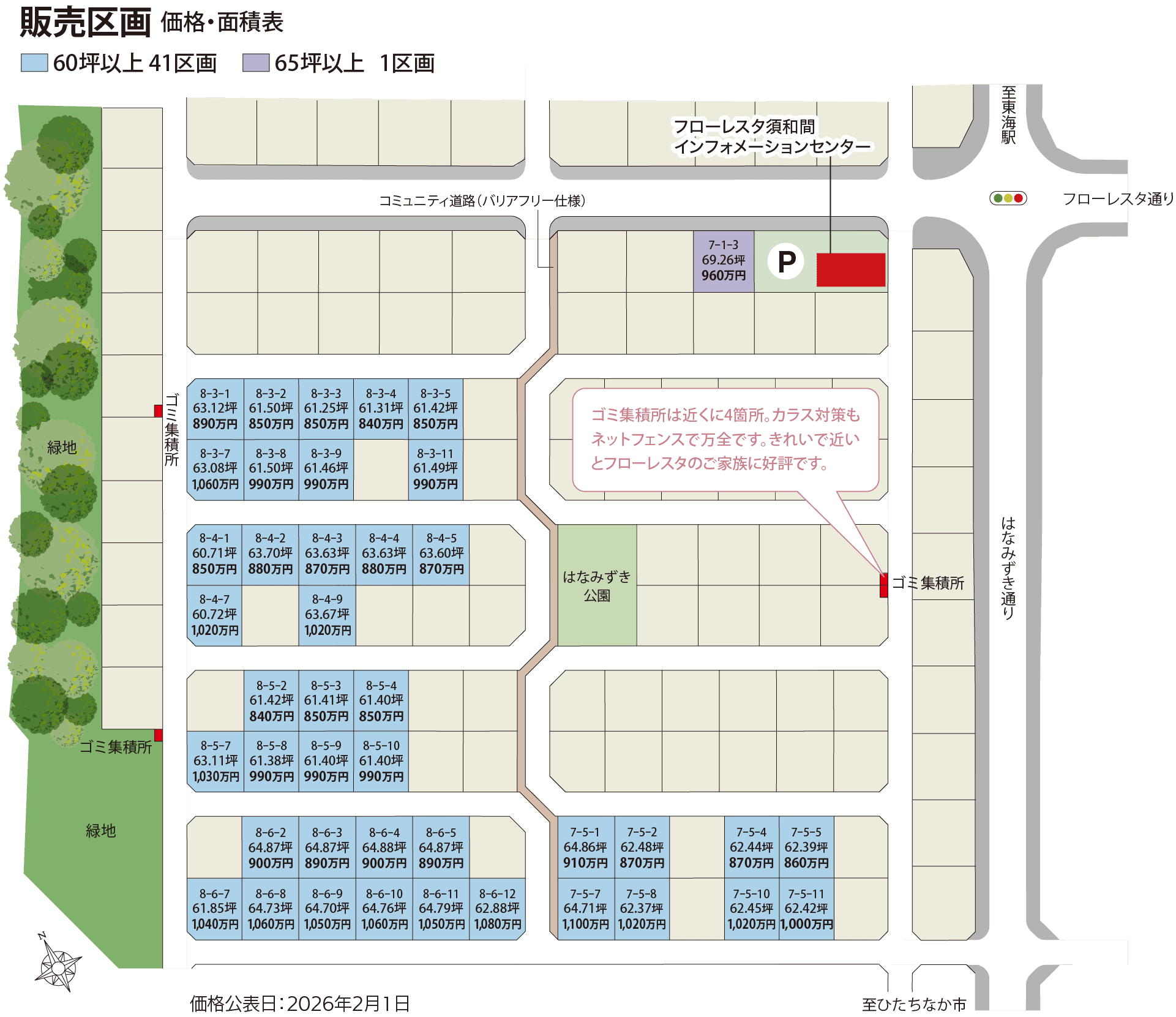 ■全体概要 ●所在地:那珂郡東海村大字須和間2005-3ほか ●交通:JR常磐線「東海駅」下車、茨城交通バス「東海駅東口~フローレスタ須和間・南台・緑ヶ丘循環線」「フローレスタ須和間北」バス停徒歩2〜5分 ●総区画数:689区画 ●都市計画区域:市街化調整区域 ●用途地域:指定なし(建築協定有) ●建ぺい率:50% ●容積率:100% ●地目:宅地 ●開発許可番号:茨城県建指令第90号 許可番号第8号(1997年12月26日)、茨城県建指令第51号 変更許可番号第7号(1999年10月26日)、茨城県建指令第32号 変更許可番号第4号(2006年12月11日)、東海村指令第492号 変更許可番号第2号(2013年7月12日)、東海村指令第813号 変更許可番号第1号(2014年8月11日)、東海村指令第365号 変更許可番号第1号(2015年4月22日)、東海村指令第1711号 変更許可番号第1号(2021年12月3日) ●検査済証番号:第5・6・12工区第12号(2015年6月1日)、第7・8工区第62号(2022年1月28日) ●道路:幹線道路16mアスファルト舗装、区画道路6mアスファルト舗装(一部インターロッキング舗装)、緑道2mインターロッキング舗装 ●私道負担:なし ●設備:電気/東京電力、飲用水/村営水道、ガス/プロパン(集中供給方式)、汚水・雑排水/公共下水道、雨水/調整池へ放流 ●管理費等:附属施設維持管理基金100,000円、ケーブルテレビ個別引込工事費44,000円、水道加入金183,600円(7工区の一部)、187,000円(7・8工区)、附属施設運営費〈タウンセキュリティ費・JWAY基本視聴料、除草作業費など〉4,000円(月額) ●手付金保全:(株)常陽銀行 ●所属団体:(公社)茨城県宅地建物取引業協会